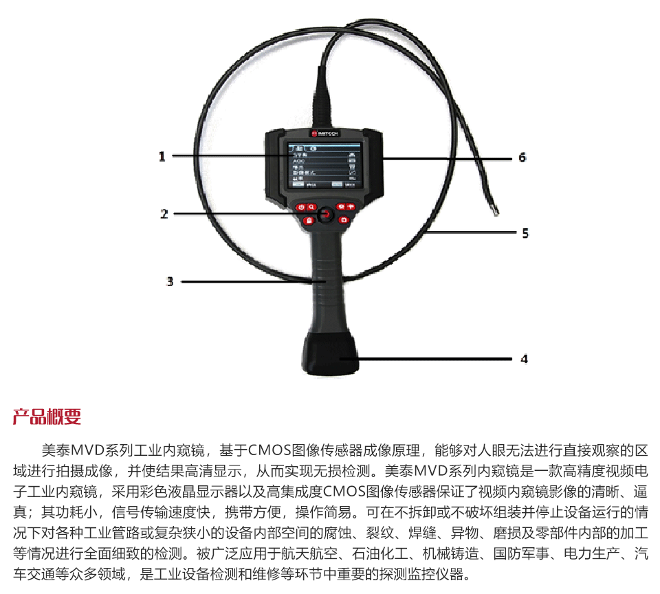 產(chǎn)品概述美泰MVD系列工業(yè)內(nèi)窺鏡,基于CMOS圖像傳感器成像原理,能夠?qū)θ搜蹮o法進行直接觀察的區(qū)域進行拍攝成像,高清顯示,從而實現(xiàn)無損檢測。美泰MVD系列內(nèi)窺鏡是一款高精度視頻電子工業(yè)內(nèi)窺鏡,采用彩色液晶顯示器以及高集成度CMOS圖像傳感器保證了視頻內(nèi)窺鏡影像的清晰、逼真;功耗小,信號傳輸速度快,攜帶方便,操作簡易??稍诓徊鹦痘蚱茐慕M裝及停止設(shè)備運行的情況下對各種工業(yè)管路或復(fù)雜狹小的設(shè)備內(nèi)部空間的腐蝕、裂紋、焊縫、異物、磨損及零部件內(nèi)部的加工等情況進行全面細致的檢測。被廣泛應(yīng)用于航天航空、石油化工、機械鑄造、國防軍事、電力生產(chǎn)、汽車交通等眾多領(lǐng)域,是工業(yè)設(shè)備檢測和維修等環(huán)節(jié)中重要的探測監(jiān)控儀器。