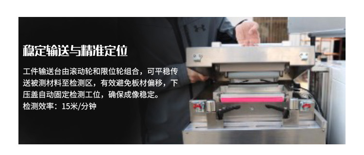 l 穩(wěn)定輸送與精準(zhǔn)定位:工件輸送臺由滾動輪和限位輪組合構(gòu)成,可平穩(wěn)傳送被測材料進(jìn)入檢測區(qū),有效防止左右偏移;板材就位后,下壓蓋自動固定檢測工位,避免上下晃動,保障成像穩(wěn)定。