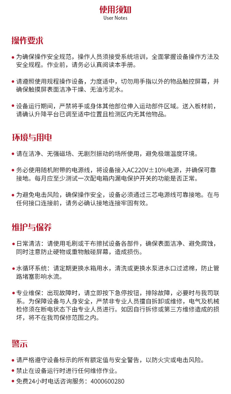 l 專業(yè)維保:出現(xiàn)故障時,請立即按下急停按鈕,排除故障,必要時與我司聯(lián)系。為保障設(shè)備與人身安全,嚴(yán)禁非專業(yè)人員擅自拆卸或維修,電氣及機械檢修須在斷電狀態(tài)下由專業(yè)人員進(jìn)行。如因自行拆修或第三方維修造成的損壞,將不在我司保修范圍之內(nèi)。